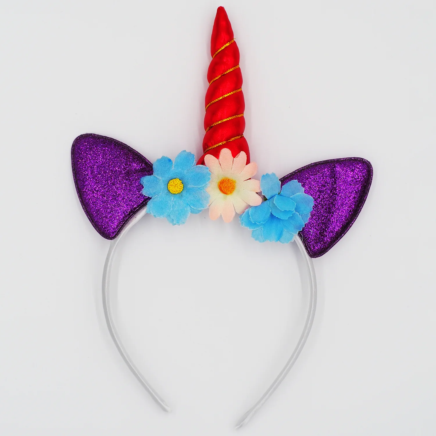 • Bentita Unicorn cu Corn Rosu, Urechiuse Mov si flori Multicolore