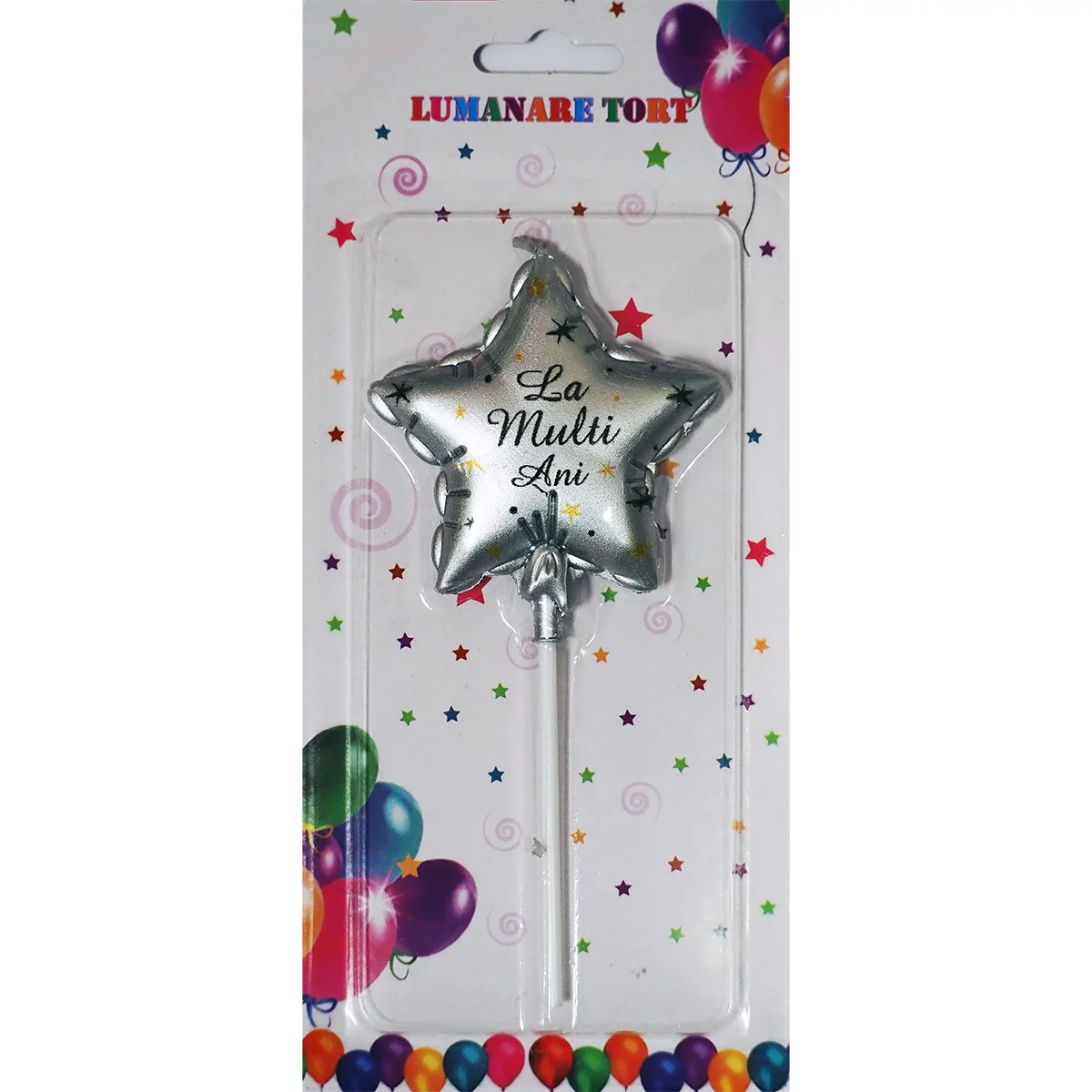 Lumanare tort in forma de steluta cu mesaj La Multi Ani, argintiu.