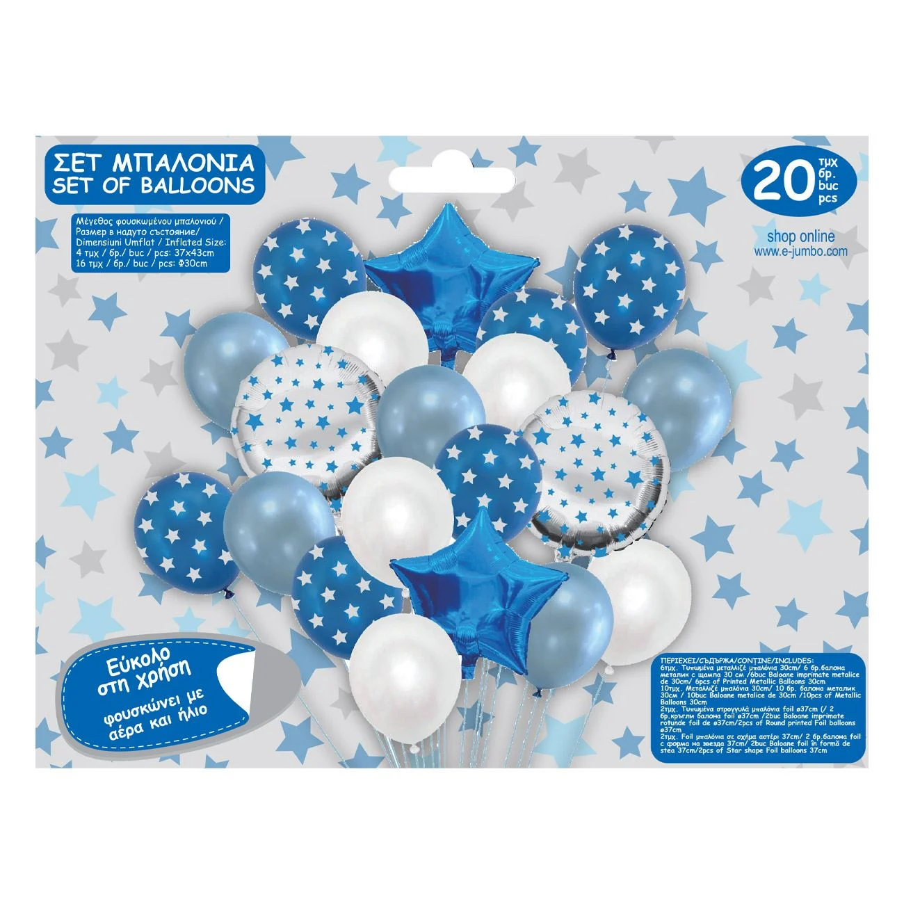 - Setul include: 2 baloane folie sub forma de stelute albastre de 45 cm, 2 baloane folie rotunde de 45 cm imprimate cu stelute, 6 baloane latex albastre imprimate cu stelute, 5 baloane latex perlate de culoare albastru deschis, 5 baloane latex perlate de culoare alba