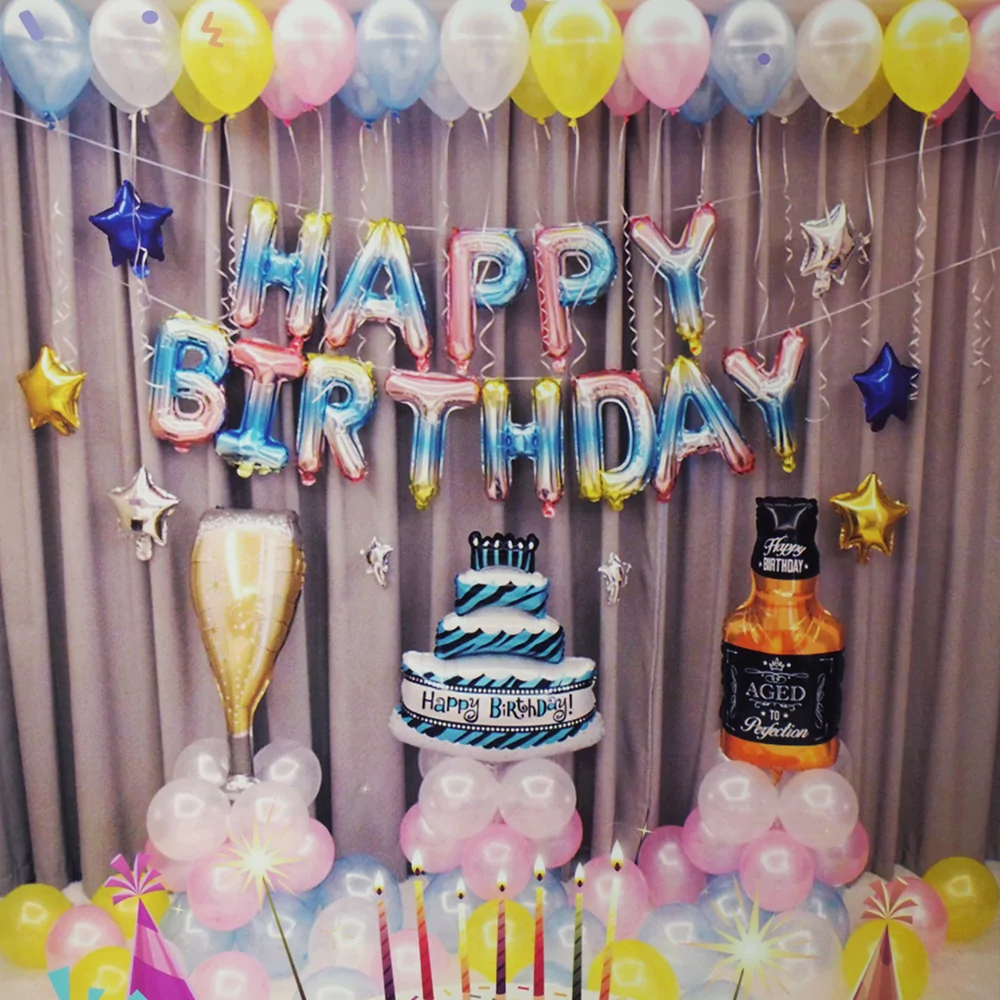 Set aranjament baloane folie si latex tort si sampanie si banner Happy Birthday, 55 buc