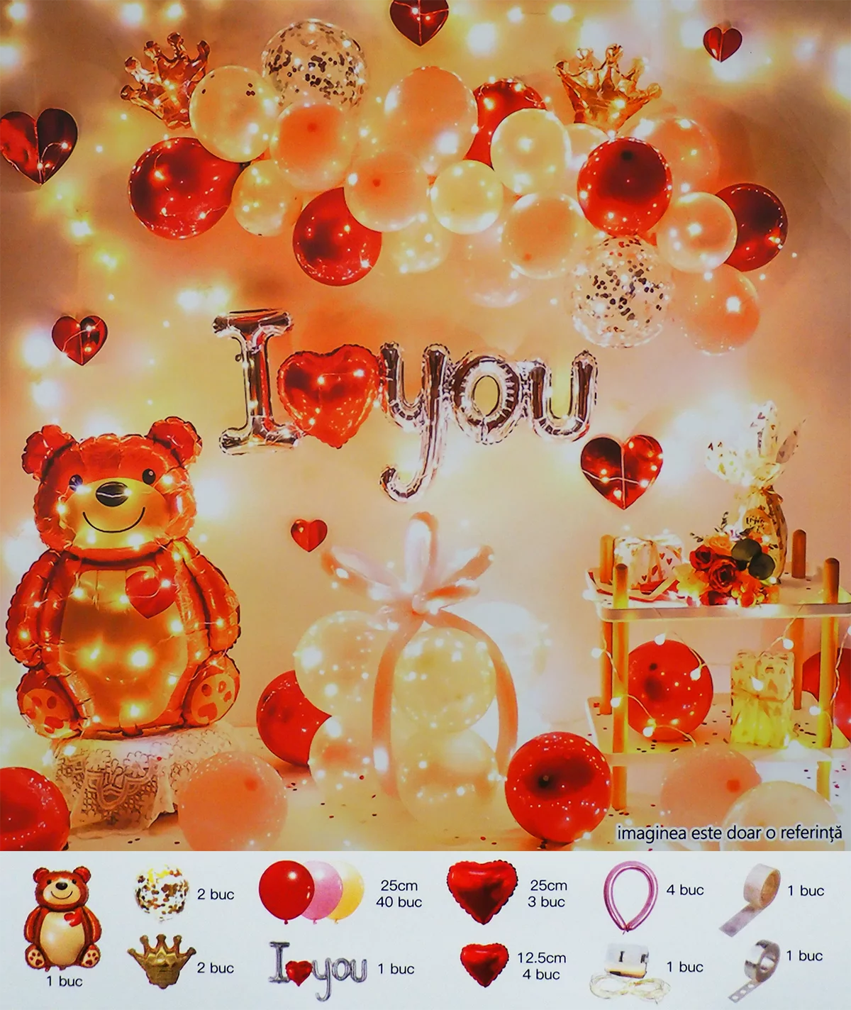 Set aranjament baloane in nuante de rosu, roz, galben, cu ursulet si fir cu led