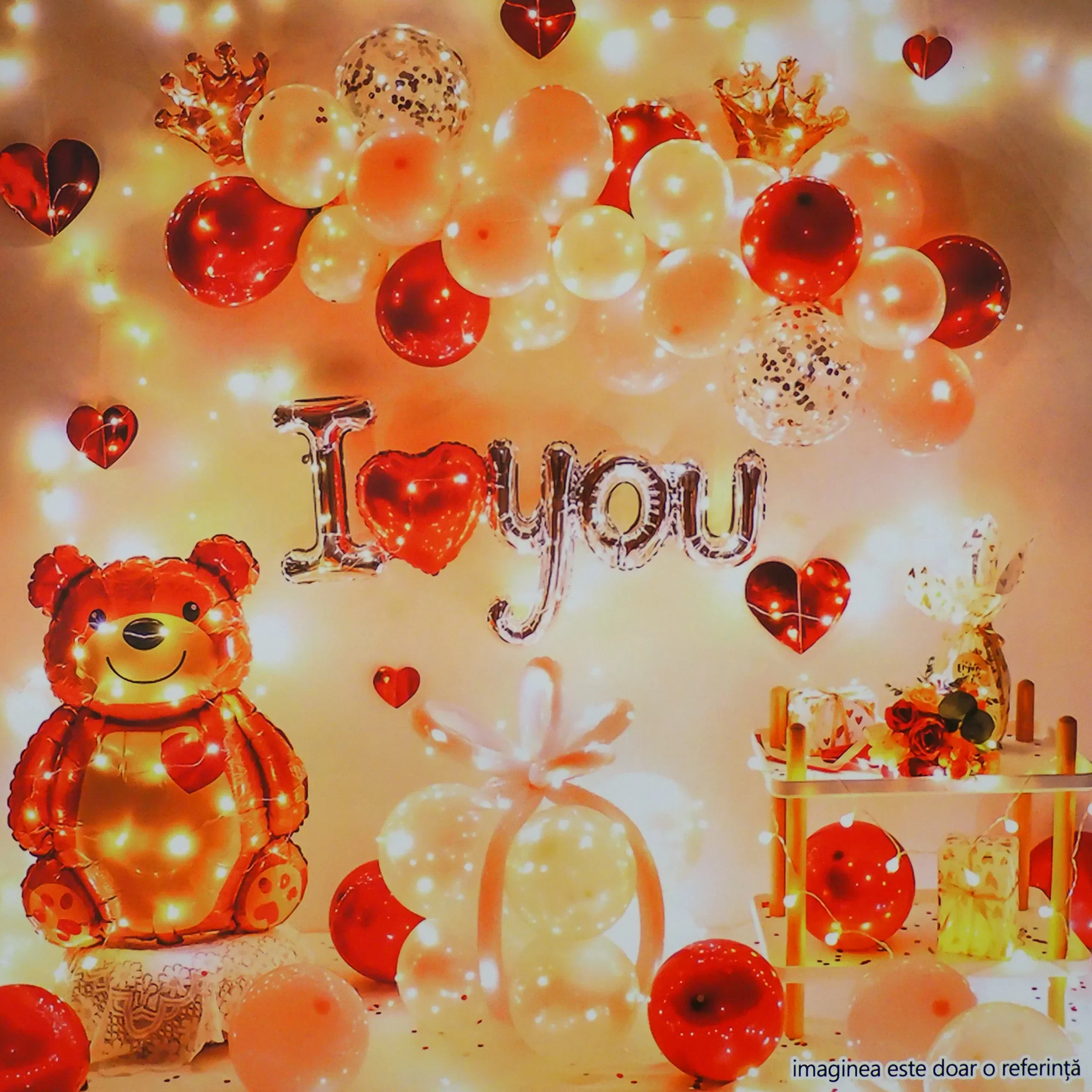 Set aranjament 56 baloane in nuante de rosu, roz, galben, cu ursulet si fir cu led