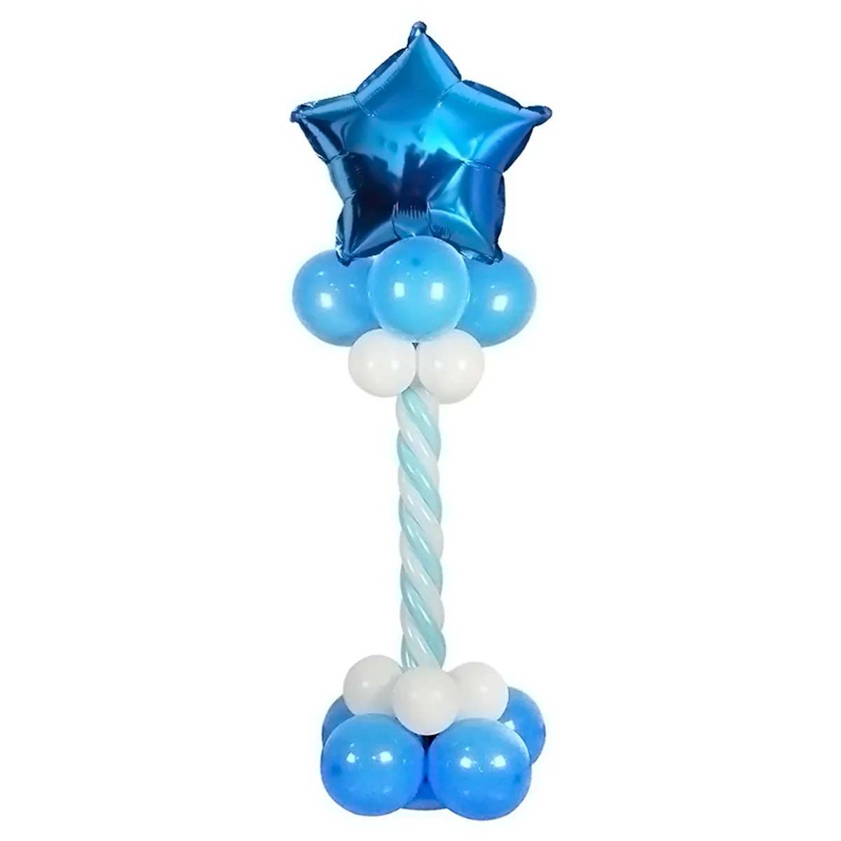 Aranjamentul cuprinde un balon folie stea roz cu dimensiunea de 45 cm, un pilon alb format dintr-o baza ce se poate umple cu apa pentru stabilitate de pus pe podea, 4 bete albe de 35 cm si 3 imbinari cu ajutorul carora veti putea face suportul. De asemenea, sunt incluse 8 baloane de latex roz de 23, 8 baloane de latex albe de 13 cm si 5 baloane latex de modelaj, 2 albe si 3 turcoaz.