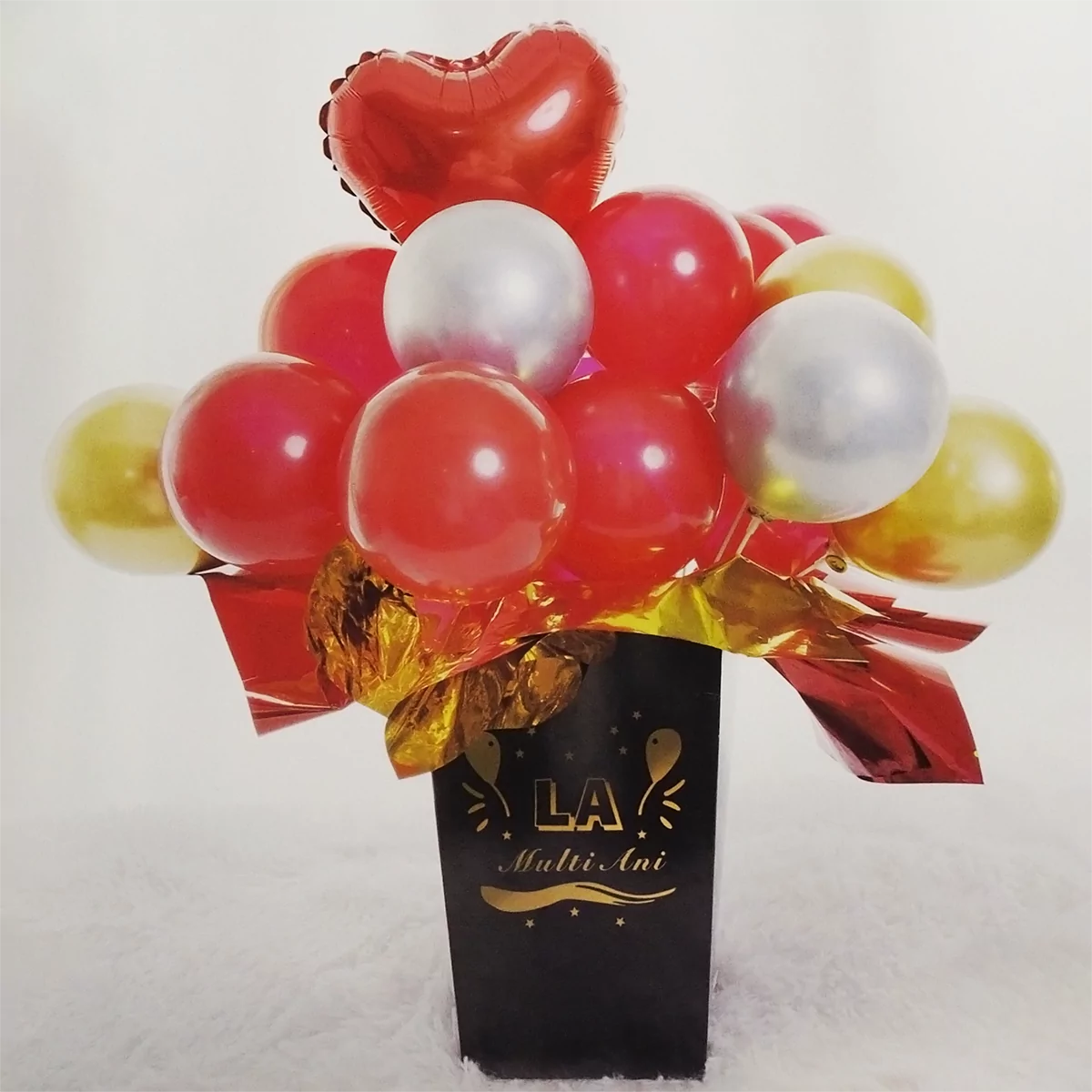 Set aranjament buchet 23 baloane rosii, argintii, aurii, in cutie cu mesaj La Multi Ani