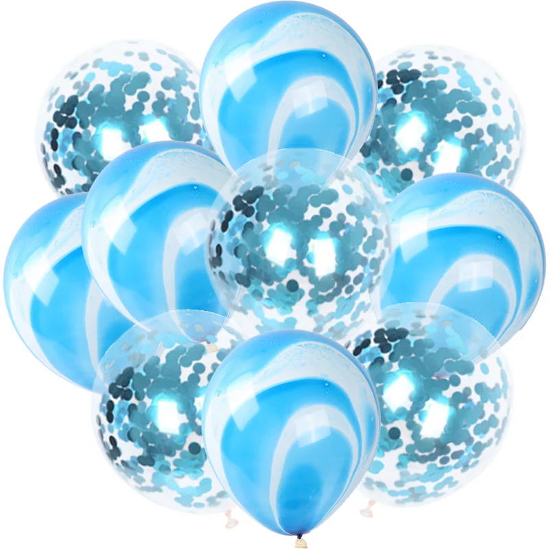 Set aranjament bundle 10 baloane, cu baloane marmorate si confetti albastre.
