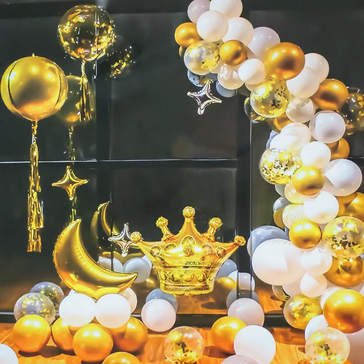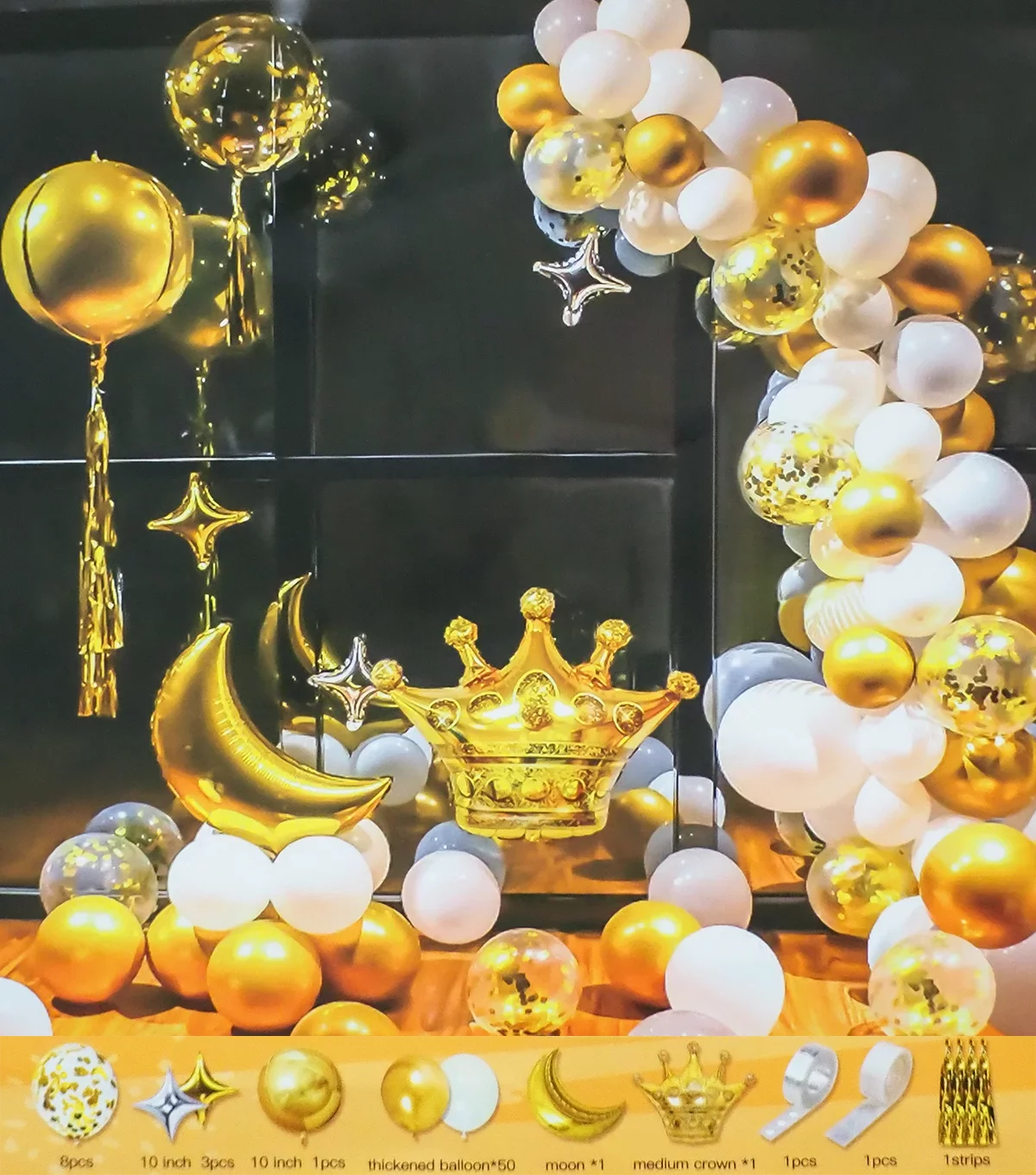 Set arcada 64 baloane in nuante auriu si alb, cu baloane folie coronita, luna, stele